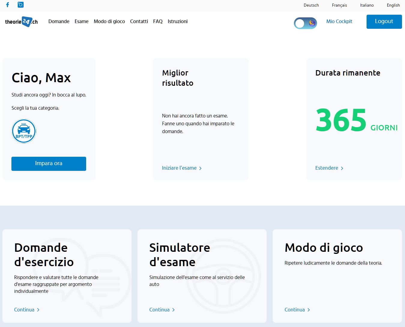 Crea un accesso online istantaneo per 365 giorni per taxi su pro.theorie24.ch